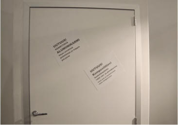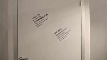 Kiinteä karmi ja erilliset peitelistat eivät sovi märkä- eikä korkeahygieniatilaan. Kiinteä karmi massasaumalla on aina “tekijänsä näköinen”. MUk LAAKAOVEN (tavallinen sivusaranoitu ovi) ovilevynä käytetään henkilöliikenteessä HPL korkeapainelami-naattilevyä ja tavara- ja trukkiliikenteessä GRP erikoissileää lasikuitulaminaattia. Molemmissa varastovärinä on valkoinen ~RAL9010 tai harmaa ~RAL7035. Kovapintainen HPL korkeapainelaminaatti kestää raapivaa kulutusta paremmin kuin pehmäpintaisempi GRP lasikuitulaminaatti, mutta luja GRP kestää paremmin iskukuormaa raskaassa tavaraliikennekäytössä. Ulkonäöltään HPL korkeapaine-laminaatti ja erittäin sileä satiini MU GRP lasikuitulaminaatti-pinta vastaavat toisiaan niin, että niitä ei pinnanlaadusta erota toisistaan. Ovessa haponkestävät saranat ovat sijoitetut lujuusopilli-sesti oikeaan kohtaan eli ovilevyn ylä- ja alaäärireunaan. Tällöin huultamattomassa ovessa ovivälykset pysyvät huomattavasti paremmin kohdallaan kuin perinteisessä saranapaikassa. Yllättävintä on ollut, että käyttäjät ja arkkitehdit ovat erittäin hyvin hyväksyneet tämän teknillisesti paremman poikkeavan ratkaisun jopa parempana ulko-näkönä. Laakaovessa voidaan käyttää perinteisen sulkimen sijasta suljinsaranaa tai piilosuljinta. Karmina on alumiininen MUkS tai MUkM säätökarmi (Pat.124377), jolloin smyygit ja listapielet muodostuvat samalla, eikä perinteisen puukarmin mukaisia erillisiä epähygieenisiä listoituksia tarvita. Tämä on korkeahygieeniatiloissa erittäin tärkeää. MU säätökarmissa on erittäin laajat säätöalueet. Säädettävän karmin etuna on muunneltavuus, jolloin karmi soveltuu myös erikoiskohteisiin. Moduulikoot ovat vakio-ovissa, mutta erikoiskoot on helppo valmistaa. Karmi on helppo kiinnittää piilokiinnityksenä (pat. 8157) ja tarvittaessa voidaan kiinnityskohtaa vaihtaa. (betoniteräs tai tiilen reikä). Tämä on tärkä asennusnäkökohta. Karmi voidaan täyttää tarvittaessa avattavan kynteputken alta uretan-vaahdolla. Karmi on edullisin asentaa, jos oviaukon ympäri suunnitellaan tasavahvuinen seinä (tumppi min 20 mm). AL karmi voidaan asentaa kyllä nurkkapieleenkin, mutta listapieltä täytyy silloin kaventaa asennettaessa. RST karmia on vaikea kaventaa siististi työmaalla. Patentoitu (Pat. 8069) Säädettävä MU RST karmi täyttää vastaavat edellä mainitut ominaisuudet. RST karmissa täytyy aina erikseen mainita, mikäli karmi lähtee suorasta seinästä tai tulee kulmapieleen. MU komposiittiovien etuna ovat, reunan kestävyys, muunneltavuus, yksilöllinen ulkonäkö ja ovet ovat silti perinteisen lasikuituoven hintaluokkaa. Muovius/MUk / ABC Kolmenkulma/ MUk laakaovi