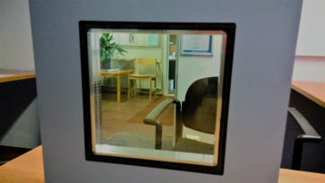 40 mm erityslasielementti, kiinnitetty hygieenisesti oven pinnan tasoon mustalla massaliimasaumalla Rekolansuora 1 | 63300 Alavus +358 (0)50 591 0776 | mu@muovius.fi